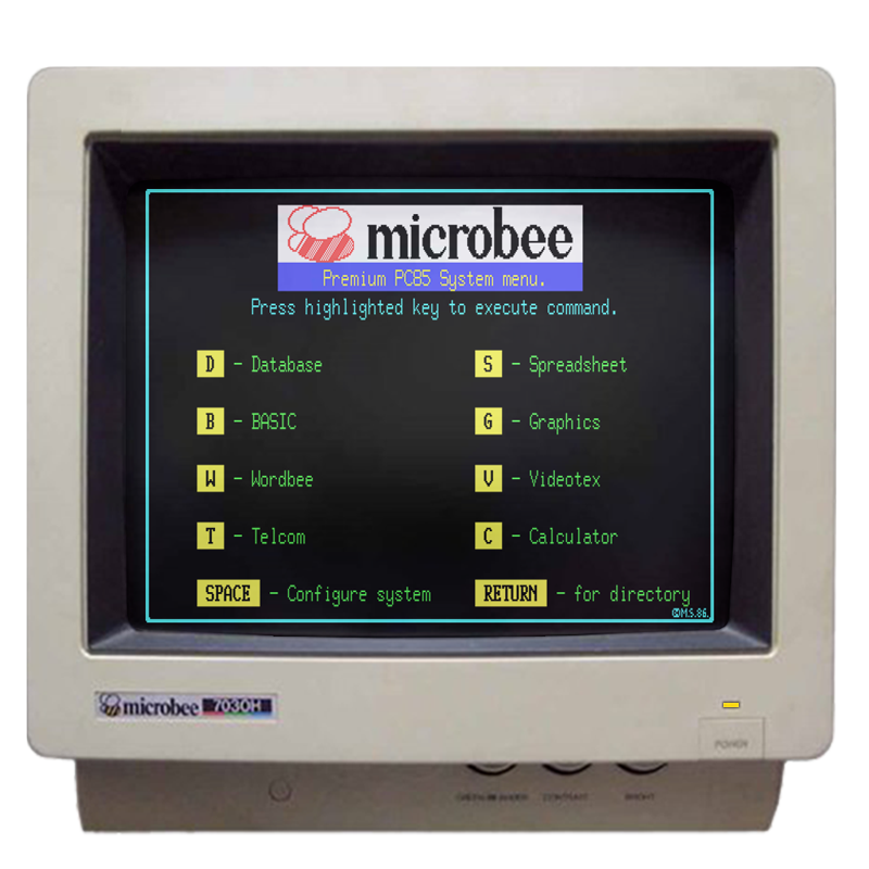 Personal Communicator (PC85) (Premium Series) 1.1. Technical spec - standard. REL : 1985 CPU : Z80 3.375MHz clock rate RAM : 32k CMOS static RAM. ROM : Main Board Revisions: Core Board Revisions: VDU : VIDEO : Monochrome standard 1 volt peak to peak composite video with negative sync. COLOUR : R.G.B. intensity with positive or negative sync. KEYBOARD : CASSETTE : Built-in to load and dump programs at 300 and 1200 baud. SERIAL : RS232. Can be used to connect modems, printers and to network with other computers. PARALLEL : 8 bit I/O fully programmable with strobe pulse for centronic printers. Connection for Star Network. SOUND : Internal speaker with volume control for BELL under CP/M. REAL TIME CLOCK : Using the Motorola RTC 146818. Battery backed with a nicad battery. DISK CONTROLLER : TMS2793NL Texas Instruments. POWER SUPPLY : 10 to 12 volts at 1.5 amps. Standby current approx 700mA to 800mA. Peak current during a single disk access 1200mA. POWER SUPPLY UNITS : For monochrome use, use the Microbee M15 monitor with the internal power supply. For Colour use, use the Microbee plug pack number 111-012 (10V, 1.5 amps). OPERATING TEMPERATURE : 5-45 degrees C. OPERATING HUMIDITY : 20%-80% relative humidity. 1.2. Technical spec - options.
